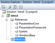 | 3) In the window titeld: Solution Explorer -Solution 'intro1' (1 project) we have to add 4 References and an intro1.cs file: 3.1 Right-click the branch References. A drop-down menu appears. 3.2 Right-click the branch intro1. A drop-down menu appears. |