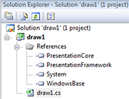 | 3) In the window titled: Solution Explorer -Solution 'draw1' (1 project) we have to add 4 References and an draw1.cs file: 3.1 Right-click the branch References. A drop-down menu appears. 3.2 Right-click the branch draw1. A drop-down menu appears. |