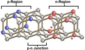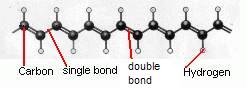 Example of a polymere-semi-conductor: Normally, the simple- and double-bounds change in exact order inside the polyacteylene-chain. In case of presence of iodine the positions of simple- and double bounds become unsharp, and electrons begin to fluctuate along the chain, but he chemical stability of the chain remains unchanged. Light emission occurs when the electrons move along the polyacteylene-chain ![]() |