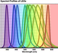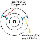 ![]() | Der Übergang von einer Quantenbahn auf eine andere, der sogenannte Elektronen- oder Quantensprung, erfolgt dabei immer unter Aufnahme oder Abgabe der entsprechenden Energiedifferenz. Beim Übergang zu einer niedrigeren Energiestufe wird die Energiedifferenz in Form eines Photons abgegeben. Absorption oder Emission von Strahlung kann nur in dem Energieabstand entsprechenden Frequenzen erfolgen. Die Energie wird dabei in Elektronenvolt (eV) angegeben. Licht emittierende Halbleiter (LED) müssen den der gewünschten Lichtfrequenz entsprechenden Energieabstand, der bei der Rekombination überbrückt wird, haben. Kurzwellige LEDs (blau oder UV) müssen eine größere Energielücke bieten als langwellige (rot). Nach entsprechenden Halbleitern wurde in der Geschichte der LED lange geforscht. Der Gesamtprozess, in dem ein Atom Energie aufnimmt und durch Photonenemission wieder zum Grundzustand zurückkehrt, heißt Lumineszenz. |