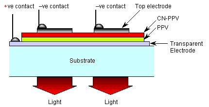 Eine Spannung von ≈ 4 Volt an +ve und -ve trennt Ladungen in den beiden Polymerschichten CN-PPV und PPV. Es entstehen entgegengesetzt geladene bewegliche Moleküle. Treffen zwei davon aufeinander, entsteht Elektrolumineszenz. Aufbau einer (monochromen) PLED-Folie:: 1. pro Pixel eine Top-Elektrode mit -ve contact = Kathode. 2. zwei Polymerschichten CN-PPV und PPV als Leuchtschichten. 3. transparente Elektrode aus Indium-Zinn-Oxyd = ITO mit +ve contact = Anode. Die 4*10-6 mm dicke ITO-Schicht ist leitfähig und trotzdem transparent. 4. Substrate = transparente Trägerschicht aus Glas oder PET |