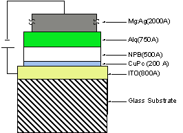 Der Film wird eingebettet zwischen eine transparente Anode und Kathode. Unter einer Spannung von 2 bis 4 Volt strömen Ladungen in den Film. Wenn Löcher und Elektronen sich auslöschen, beginnen die organischen Moleküle des halbleitenden Films je nach Material rot oder grün oder blau zu leuchten mit guter Effizienz von ca. 50-100 Lumen pro Watt.