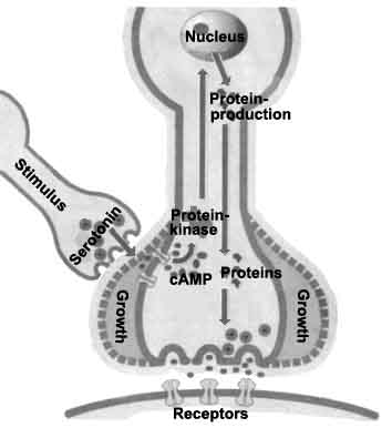 Die haarfeinen Kontaktstellen zwischen zwei Neuronen, wo die Zellwände über Botenstoffe elektrisch umpolarisierbar sind (=Synapsen) sind Sitz eines Prozesses, den wir "Langzeitpotenzierung = LTP" nennen. Wenn zwei verschaltete Neuronen gleichzeitig feuern, wird ihre synaptische Bindung vertieft. Der gleiche Stimulus löst danach eine stärkere Reaktion aus: "Sensibilisierung". Wahrscheinlich sind beide Zellwände beteiligt: Auf der Sendeseite = Präsynapse vergrößert sich der Synapsenkolben und auf der Empfangsseite = Postsynapse steigt die Sensibilität. Die beteiligten Prozesse im Zellinneren werden neuerdings schemenhaft sichtbar: cAMP stimuliert Enzyme, die sogenannten "Proteinkinasen" welche die Fähigkeit besitzen, andere Proteine durch Anhängen einer Phosphatgruppe strukturell zu verändern. Die Proteinkinasen wirken zweifach: Sie verändern Zellwandproteine so, dass die Zellwand erregbarer wird (Ca-Ionen Sperre) und sie erhöhen die Ausschüttung von Transmittern in den Spalt. Sie verändern jedoch nichts dauerhaft, ihre Wirkung bleibt kurzfristig: sie sind offensichtlich die Träger des Kurzzeitgedächtnisses. Für dauerhafte Änderungen wird ein viel komplizierterer Prozess in Gang gesetzt: (1) hochfahren der Produktion von Zellwandproteinen im Zellkern (2) Transport zur Synapse und (3) Einbau dort in die Zellwand. Erst nach Abschluss der 3 Teilprozesse ist der Inhalt des Kurzzeitgedächtnisses in haltbare Form überführt: Die Synapse reagiert nunmehr stärker und schneller.